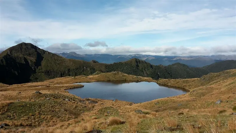 This route leads up the valley to a tussock basin enclosed by steep granite cliffs.